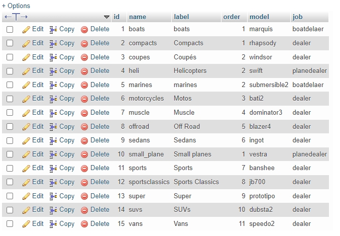 We can add a new category in a database for the shop which will be in a table called categories_vehicles