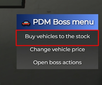 In the boss menu, you can see an item menu called "Buy vehicles to the stock"