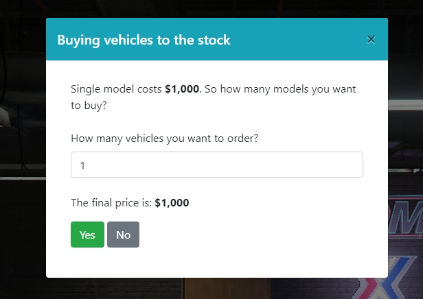 So just type how many cars you want to order for your vehicle shop and confirm the payment.