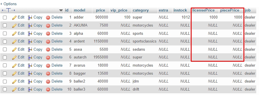 We need to focus on licensePrice and piecePrice these two columns have to be both filled in order for the "instock" to work in-game